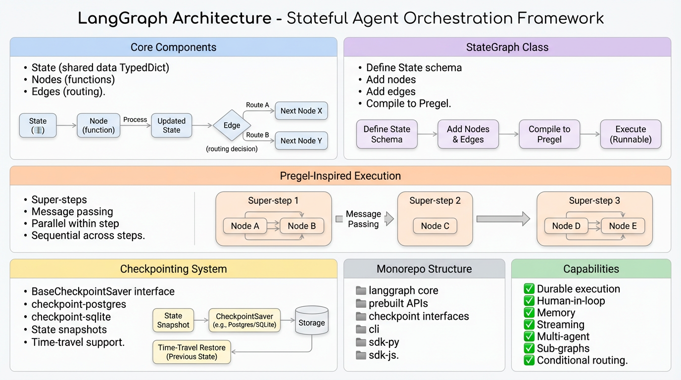 }Clean technical architecture diagram titled "LangGraph Architecture - Stateful Agent Orchestration Framework" White background, 2x3 grid layout with soft pastel colored section headers TOP ROW: [Core Components] soft blue header - bullet list: State (shared data TypedDict), Nodes (functions), Edges (routing). Below: flow diagram State to Node to Updated State to diamond Edge Decision to Next Node [StateGraph Class] soft purple header - bullet list: Define State schema, Add nodes, Add edges, Compile to Pregel. Below: linear flow Define Build Compile Execute MIDDLE ROW full width: [Pregel-Inspired Execution] soft orange header - Left: bullets for Super-steps, Message passing, Parallel within step, Sequential across steps. Right: three connected boxes showing Super-step 1 with Node A Node B, arrow to Super-step 2 with Node C, arrow to Super-step 3 with Node D Node E BOTTOM ROW: [Checkpointing System] soft yellow header - BaseCheckpointSaver interface, checkpoint-postgres, checkpoint-sqlite, State snapshots, Time-travel support. Small flow State to Checkpoint to Storage [Monorepo Structure] soft gray header - package list: langgraph core, prebuilt APIs, checkpoint interfaces, cli, sdk-py, sdk-js [Capabilities] soft green header - checkmark list: Durable execution, Human-in-loop, Memory, Streaming, Multi-agent, Sub-graphs, Conditional routing Style: Clean minimalist, soft pastel headers, thin borders, generous whitespace, easy to read, professional C4 style documentation diagram