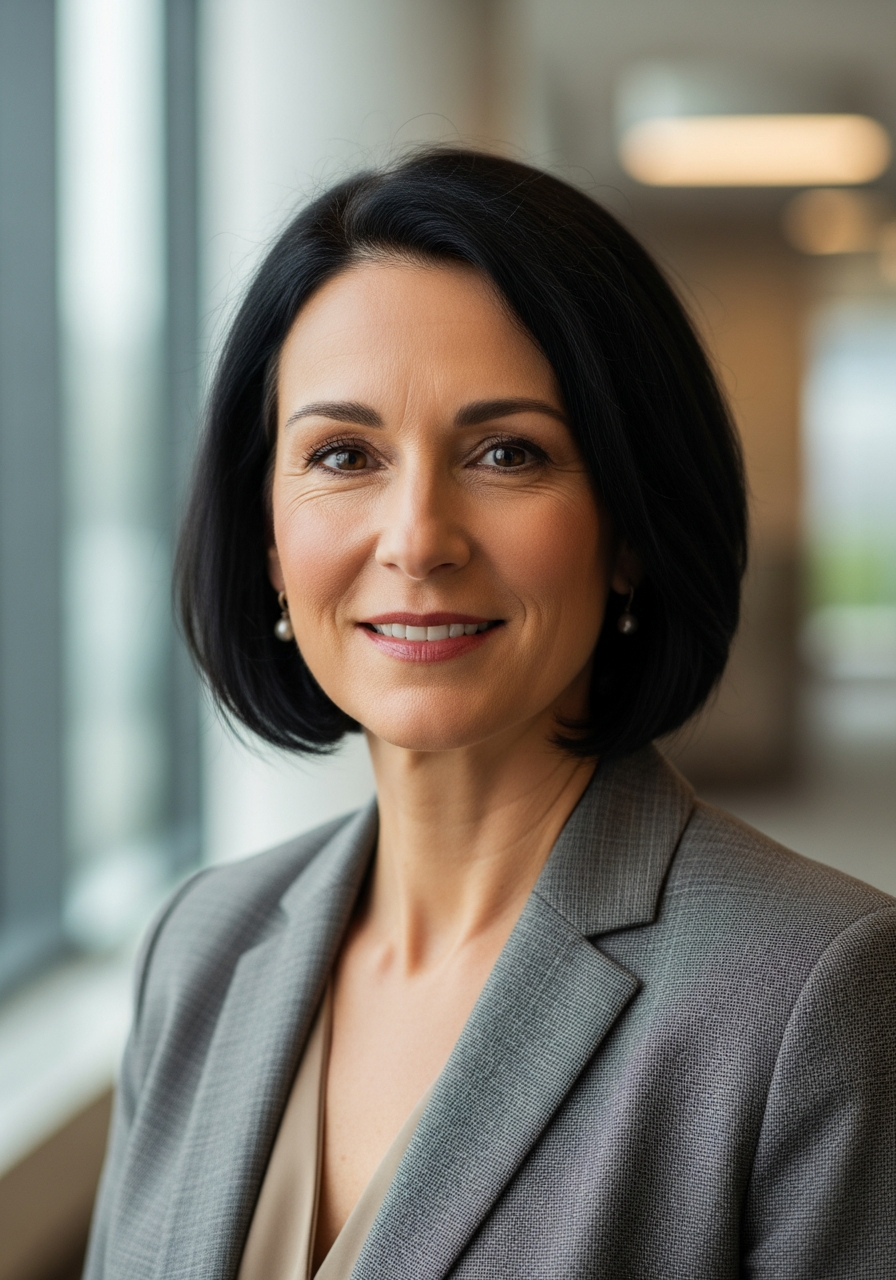 Professional headshot portrait of a middle-aged business woman, natural lighting, shallow depth of field, corporate background