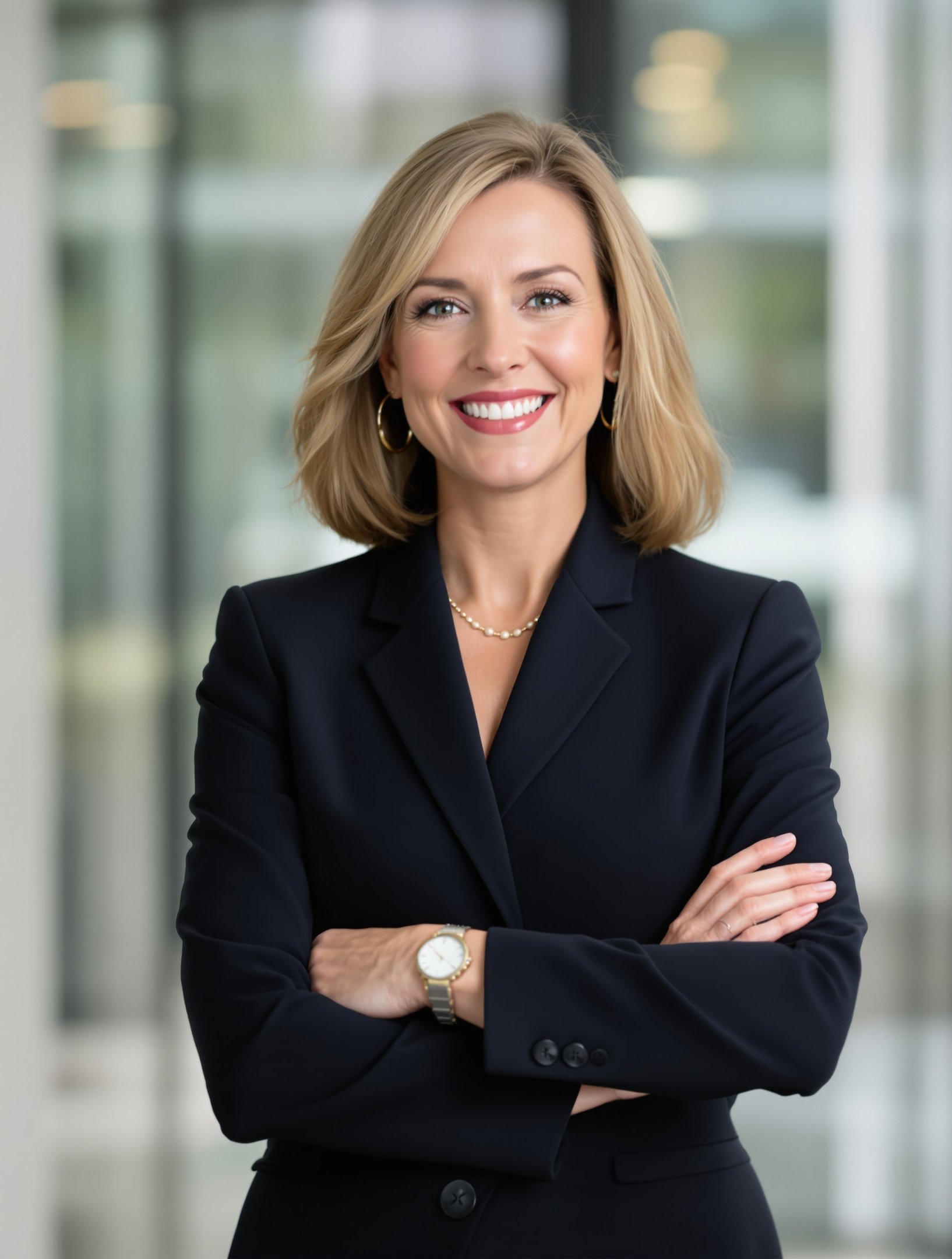 }Professional headshot portrait of a middle-aged business woman, natural lighting, shallow depth of field, corporate background