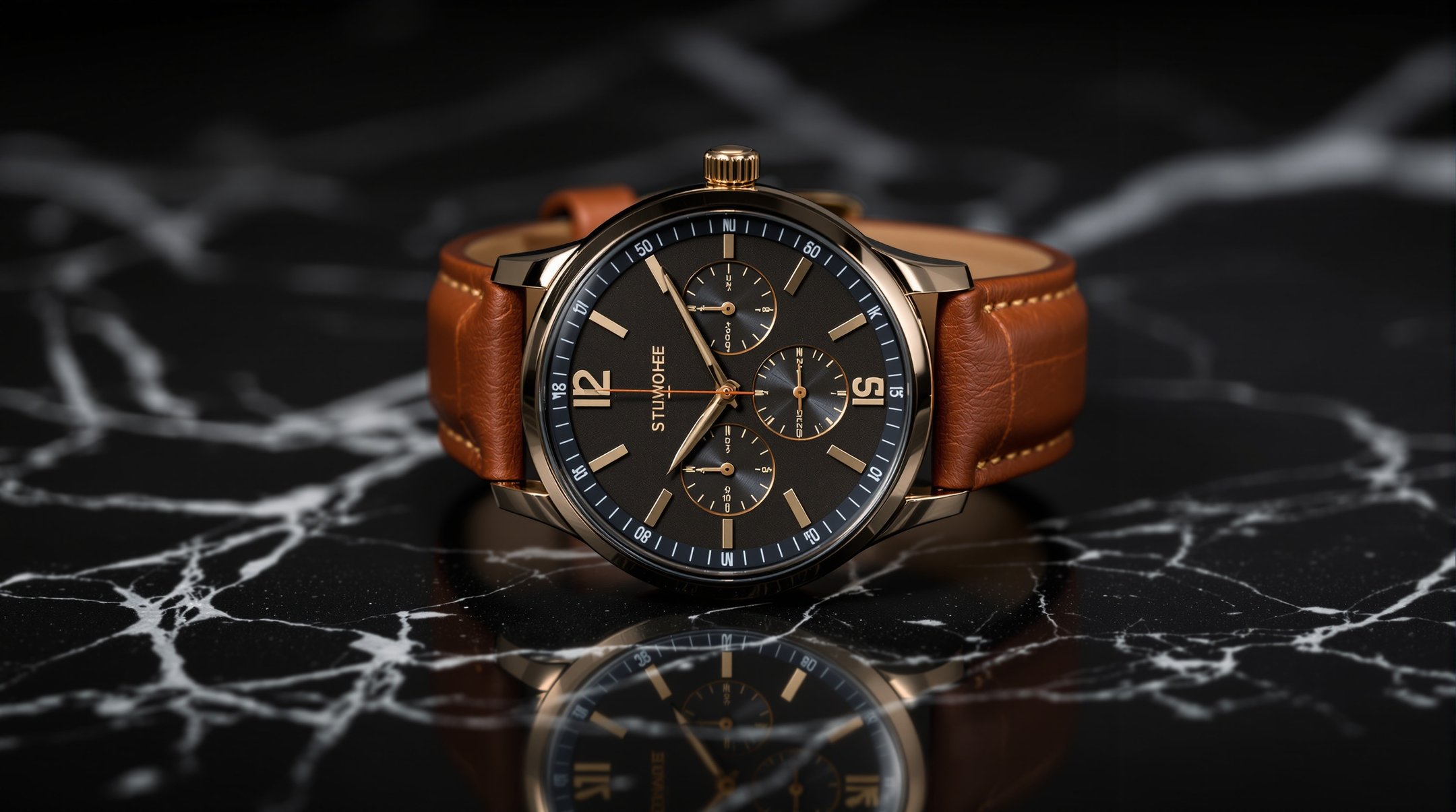 Prompt: "Product photography of a leather watch on a marble surface, studio lighting, high detail, commercial quality"