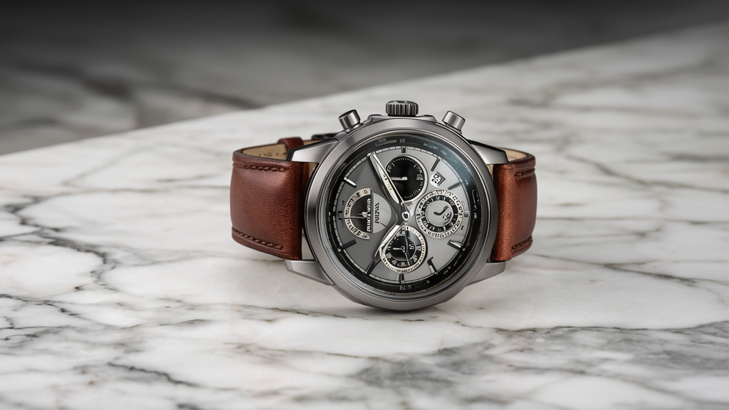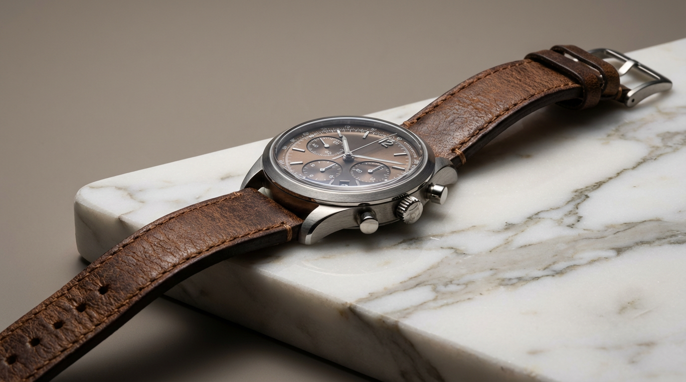 }Product photography of a leather watch on a marble surface, studio lighting, high detail, commercial quality